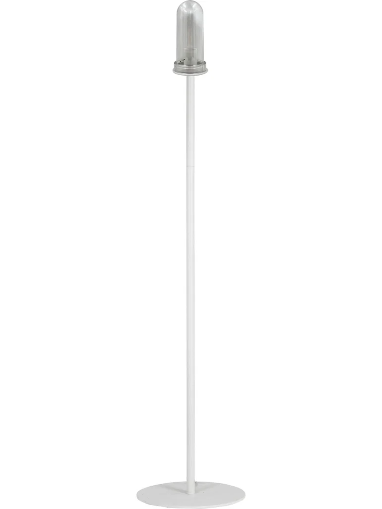 En stilfull golvfot för utomhusbruk som går att kombineras med utomhusskärmar. Över ljuskällan och lamphållaren sitter ett vitt plastlock samt en packning som skyddar mot väta.