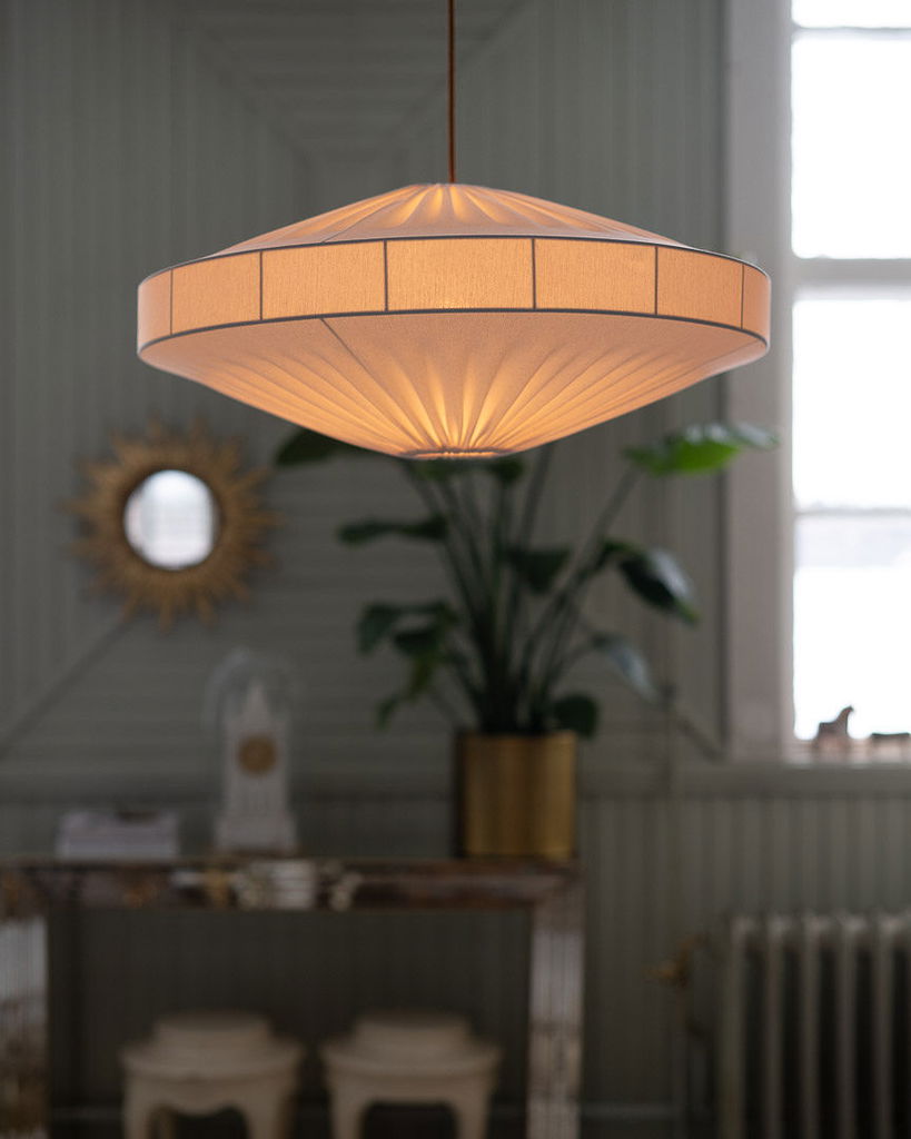 En handtillverkad lampskärm i ett stretchigt Jersey tyg som får lampskärmen Alba en mjuk och vacker veckning. Lampskärmen kan användas som takpendel eller plafond beroende på vilket fäste du kombinerar den med.