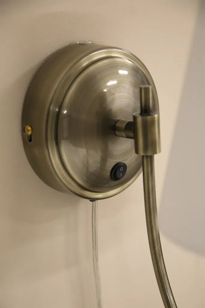 En dekorativ och funktionell vägglampa i en mjukt formad stomme i metall med en antik mässingsfinish som är kombinerad med en elegant offwhite linnelampskärm.
