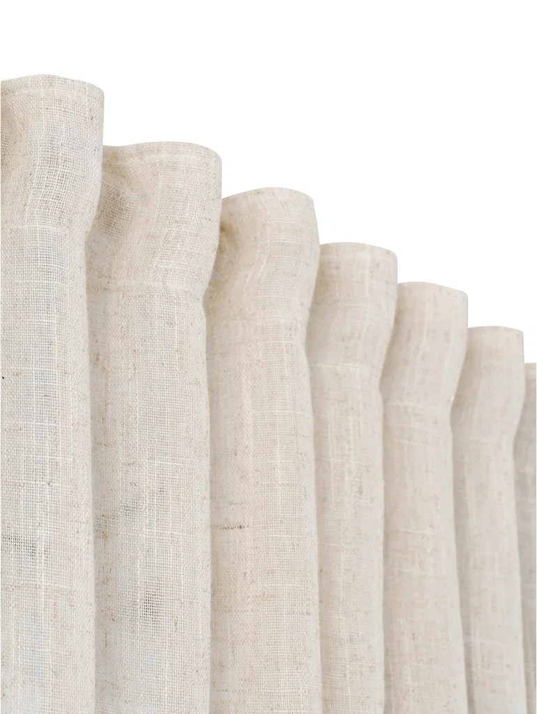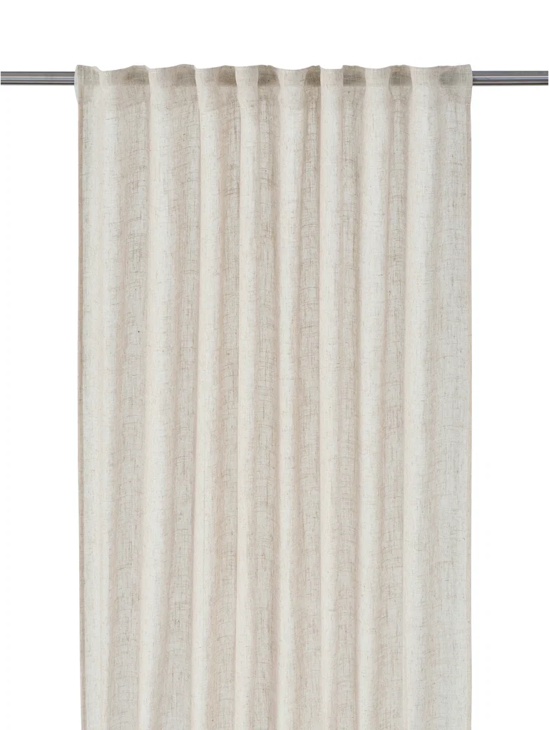 Kommer i ett 2-pack. Gardinerna har multihead-tejp upptill, sydda långsidor och överlocksöm längst ner. Multi-head-tejpen är en flexibel lösning som gör att gardinen kan hängas med metallkrokar eller direkt på stången beroende på vilken veckeffekt som önskas.