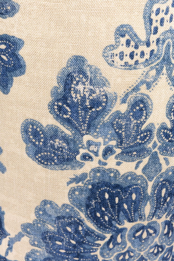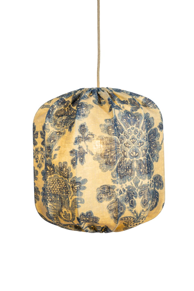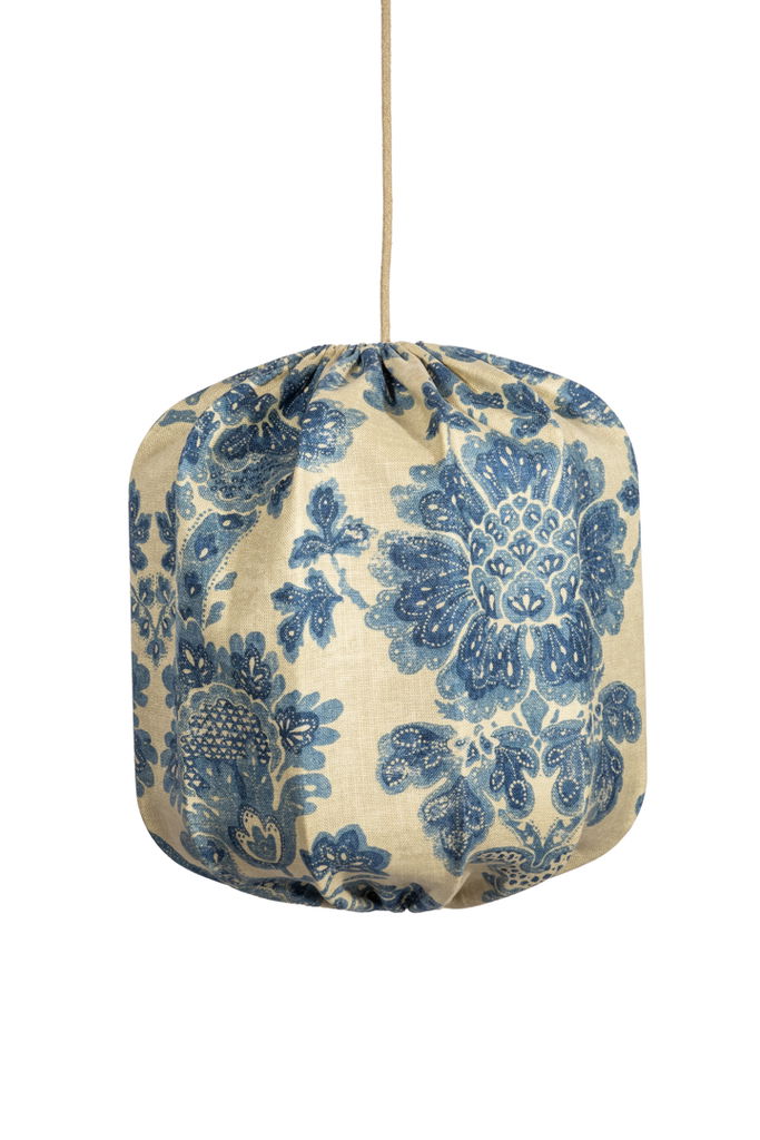 En vacker, handsydd lampskärm tillverkad i ett linnetyg med ett vackert blått mönster. När lampan tänds framträder färgerna ännu mer och ger ett varmt dämpat sken.