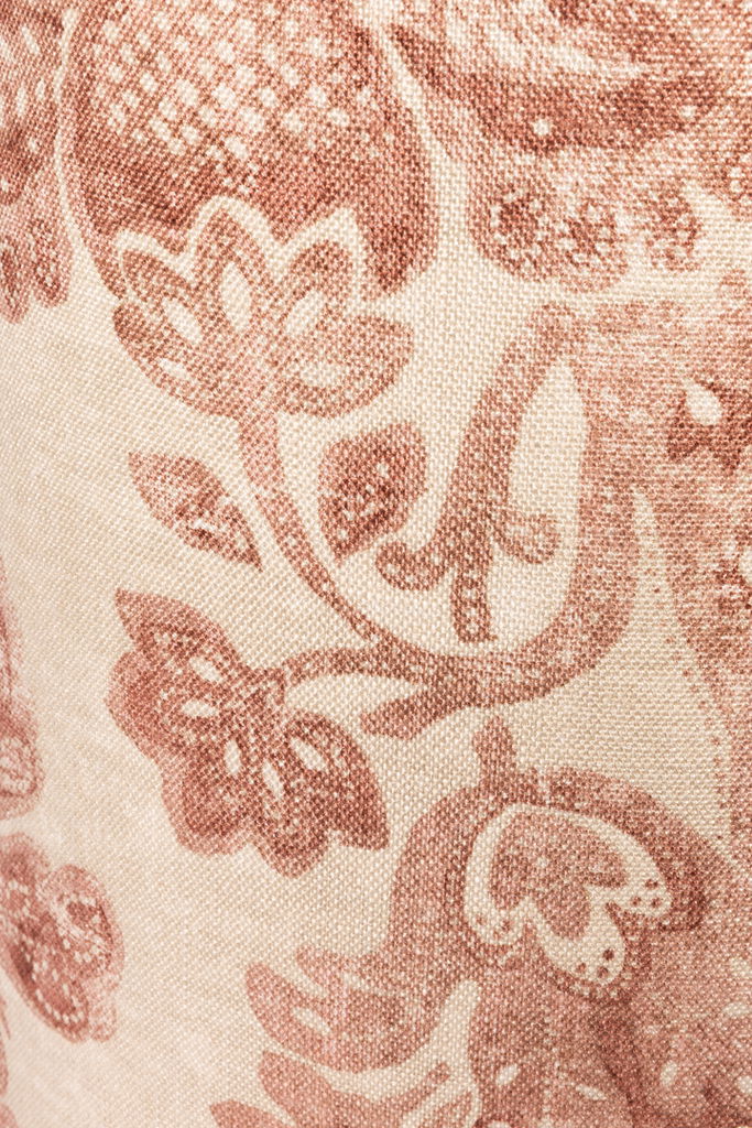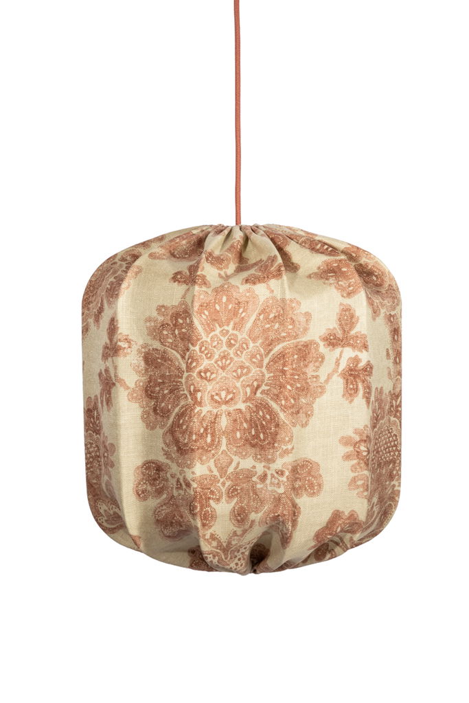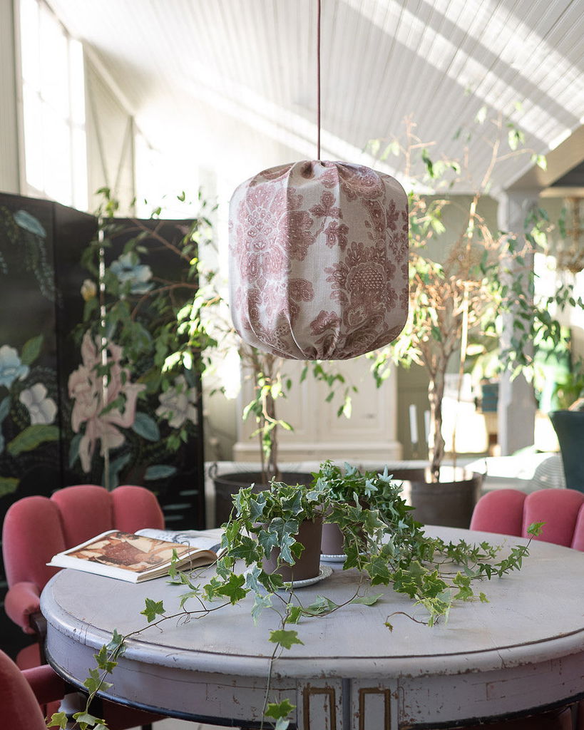 En vacker, handsydd lampskärm tillverkad i ett linnetyg med ett vackert vinrött mönster. När lampan tänds framträder färgerna ännu mer och ger ett varmt dämpat sken.