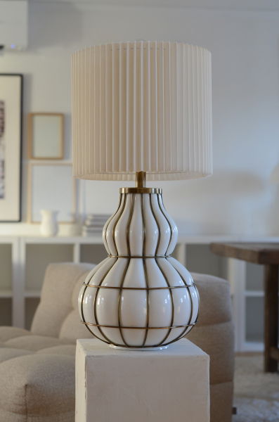 En elegant och iögonfallande lampfot i vitt glas med mässingsdetaljer.