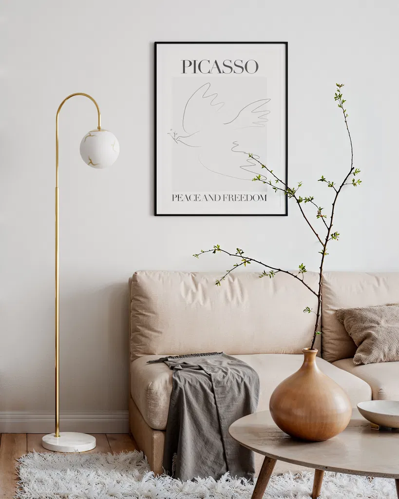 Lampans fot är tillverkad i elegant vit marmor, vars naturliga ådring gör varje exemplar unikt. De exklusiva detaljerna i mässing förstärker uttrycket och skapar en harmonisk helhet som passar lika bra i det moderna hemmet som i mer traditionella miljöer. Lampans dekorativa skärm i marmorerat glas ger ett mjukt och behagligt ljusflöde.