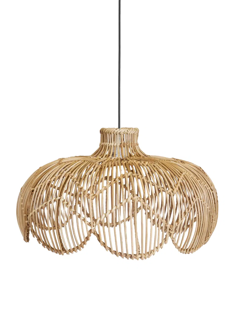 Den vågiga kanten ger mjuka linjer och en touch av bohemisk charm till varje rum, medan den smala halsen upptill diskret döljer kabelpassningen på ett stilfullt sätt.
