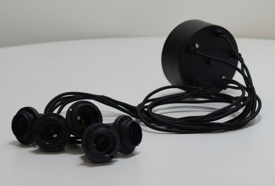 Ett stilrent upphänge i svart metall med 5st svarta tygsladdar och E27-sockel. Ett upphänge för 5st glaskupor eller lampskärmar. Passar med samtliga Bistro glaskupor samt med andra som kräver en E27-sockel.