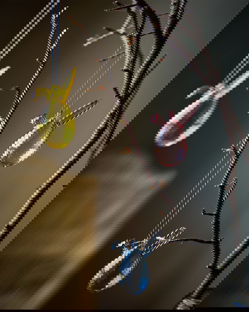 6st små söta dekorationer form av en kanin i glas med två var i varje färg rosa, gul och blå. Gör sig fin att dekorera i påskriset, eller runt om i hemmet för en stilren dekoration.