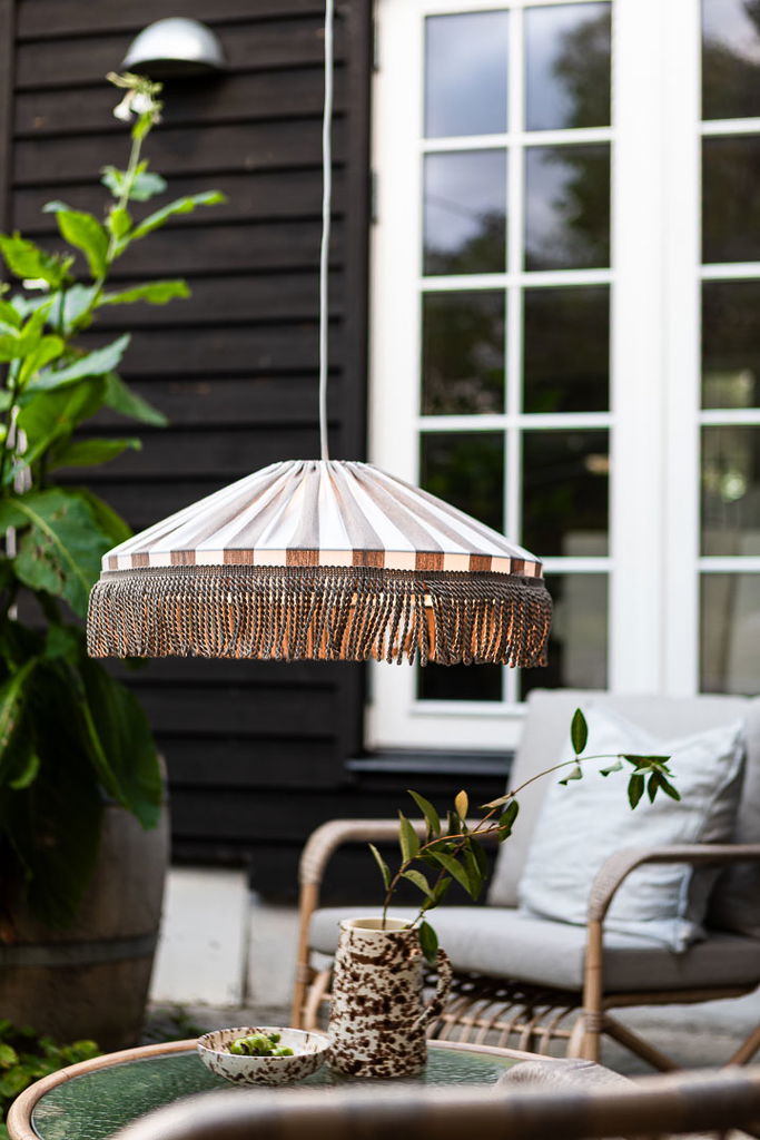 En elegant taklampa för dina utomhusmiljöer! Är tillverkad av väderbeständiga material där både tyg och frans är vattenavvisande och UV-beständiga. Kommer med 5m gummikabel, matchande takkopp och E27-sockel.
