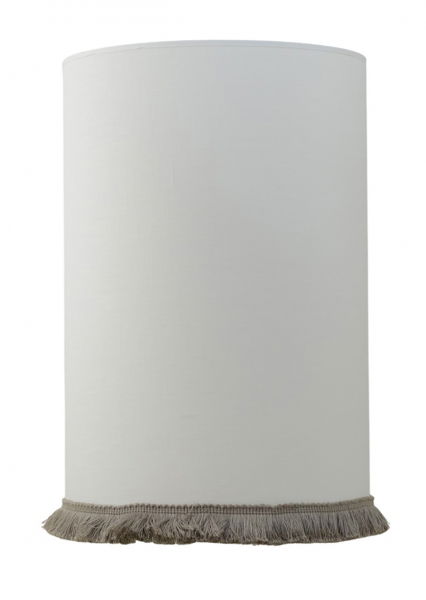En stilren och elegant cylinder formad lampskärm i ett vitt linnetyg med en dekorativ naturfärgad frans.