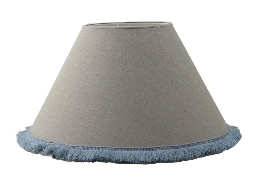 En stilren och klassisk konformad lampskärm i naturfärgat linnetyg med en dekorativ ljusblå frans. Välj mellan fyra olika storlekar.