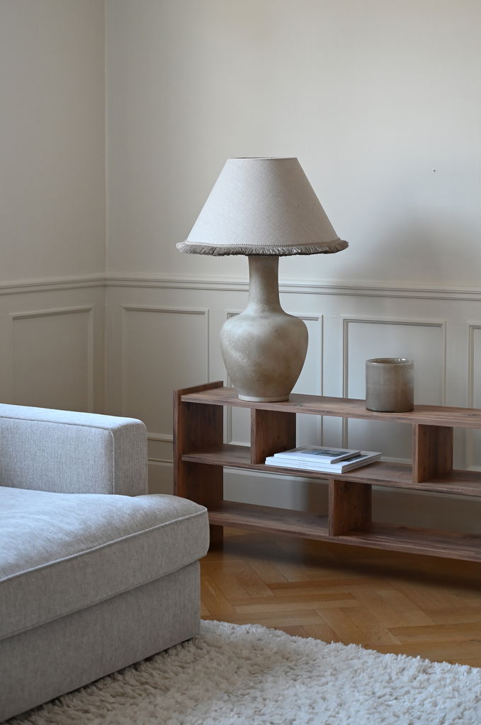 En stilren och klassisk konformad lampskärm i naturfärgat linnetyg med en dekorativ naturfärgad frans.