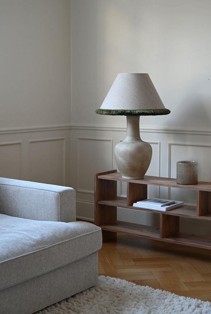 En stilren och klassisk konformad lampskärm i vitt linnetyg med en dekorativ grön frans.