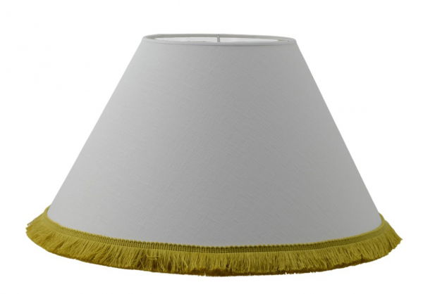 En stilren och klassisk konformad lampskärm i vitt linnetyg med en dekorativ guldfärgad frans. Välj mellan fyra olika storlekar.
