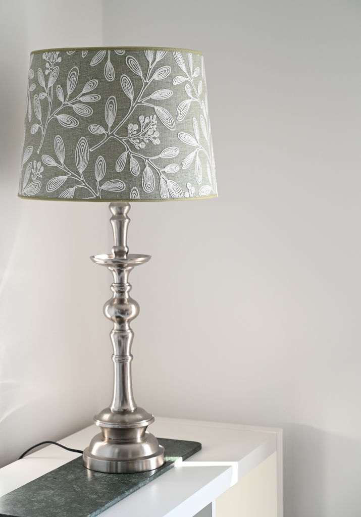 En handsydd elegant lampskärm som är tillverkad i linne med ett vackert broderi på. Har en mjuk grön naturton som kombineras enkelt med valfri lampfot. Välj mellan fyra olika storlekar, samtliga har ett E27-ringfäste.