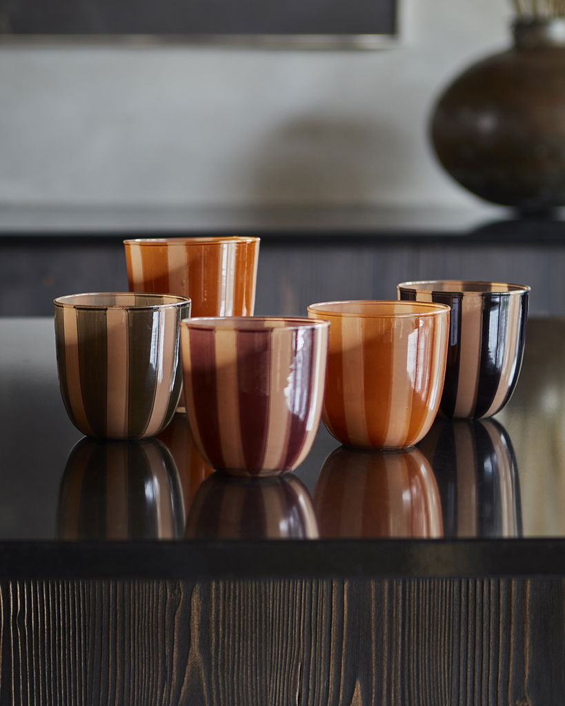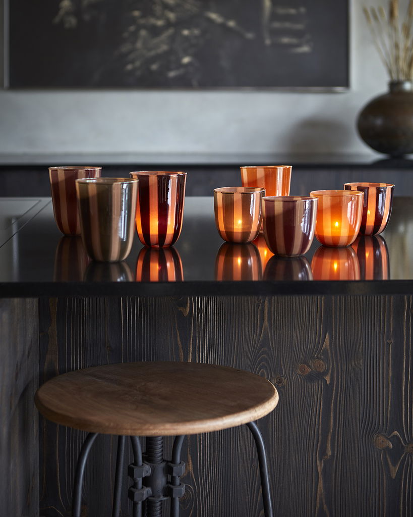 Stilrena och moderna värmeljushållare i glas som har bordeaux/beige ränder. Circus blir en uppfriskande inredningsdetalj som gör sig fin i alla miljöer.