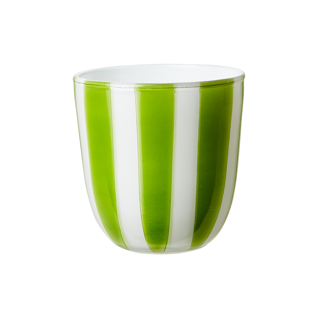 Stilrena men samtidigt utstickande värmeljushållare i glas som har gröna/vita ränder. Circus blir en uppfriskande inredningsdetalj som gör sig fin i alla miljöer.