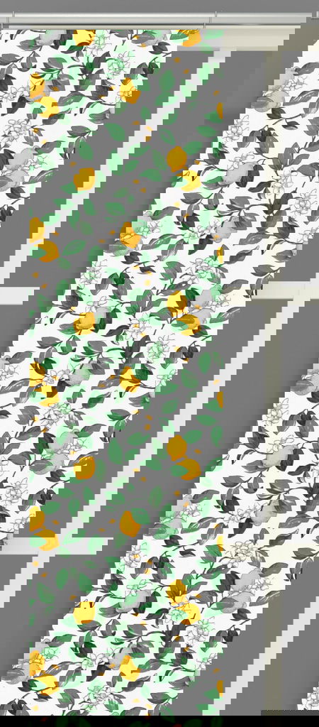 2-pack gardiner i panellängd med ett mönster av citroner som är designad av Mialotta Arvidsson-Mars. Panellängder är smala längder som hänger raka från gardinstången. De ramar in fönstret på ett fint sätt.
