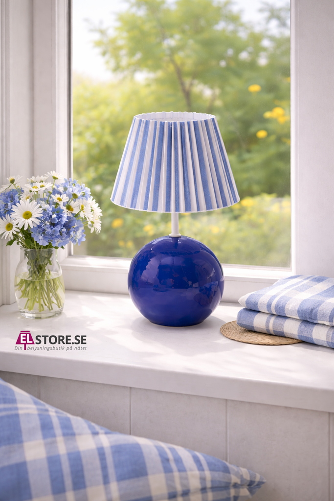 En komplett bordslampa där du får ljuskälla med på köpet! Lumiery lampfot i metall i färgen royal blue, kombinerad med Costa Nova lampskärm i ljusblått.