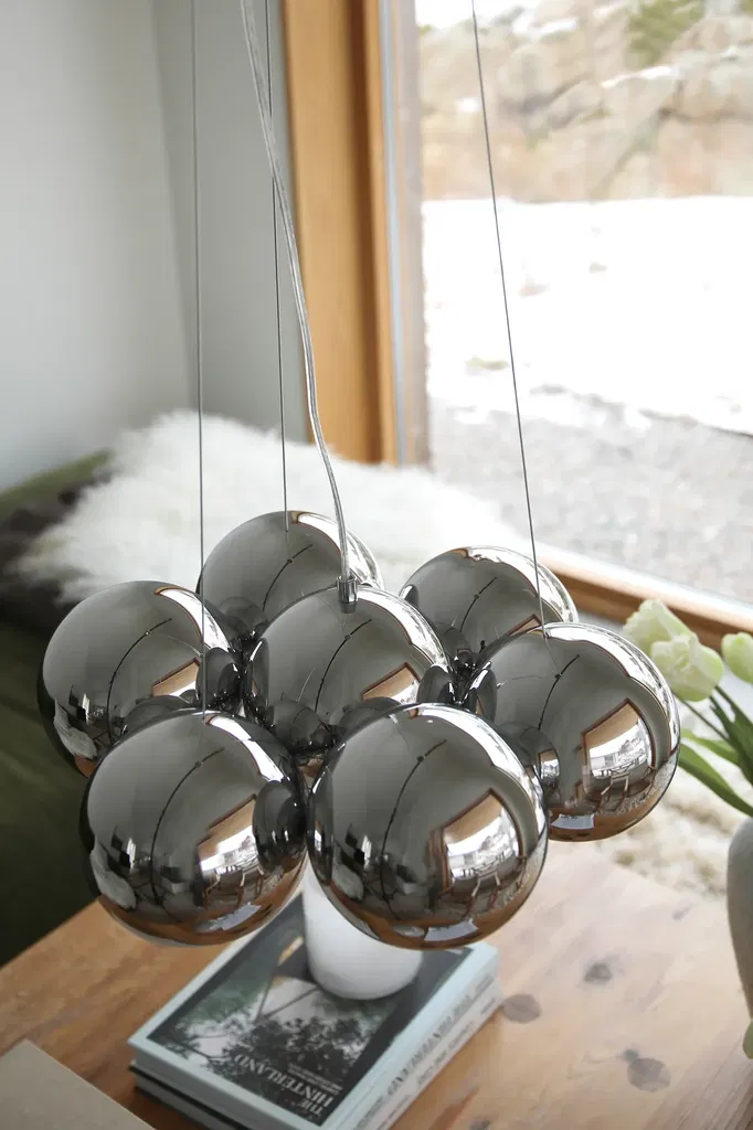 En modern och pampig taklampa designad av Joakim Thedin är en iögonfallande taklampa med sju glober samlade i en mjukt rundad form.