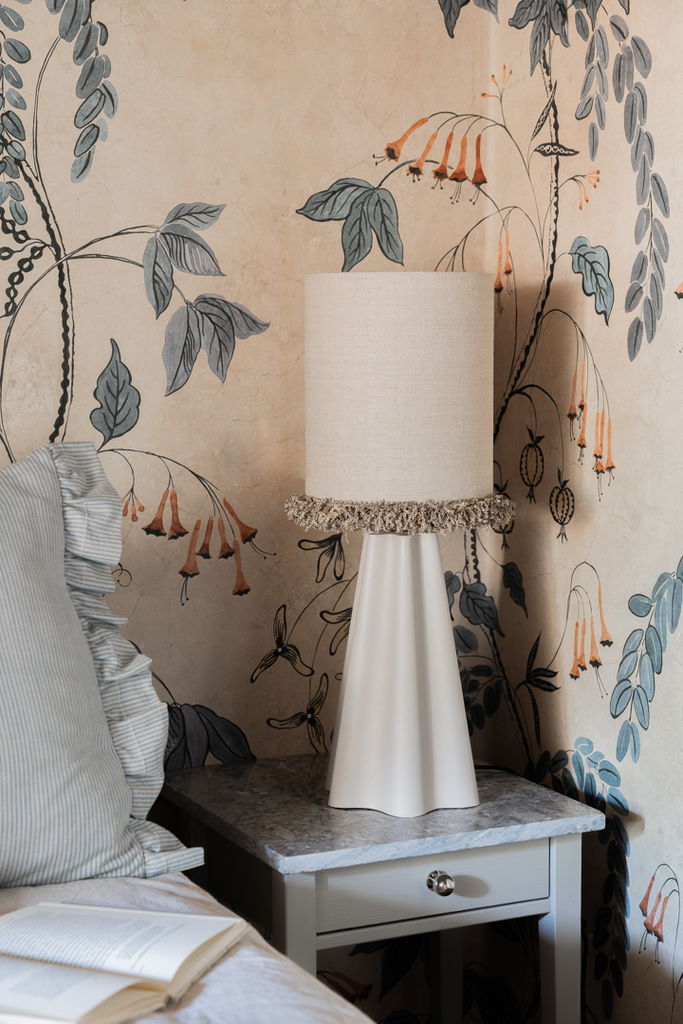 Elegant cylinderformad lampskärm i oblekt lin med dekorativ frans. Perfekt för både retro och modern inredning.