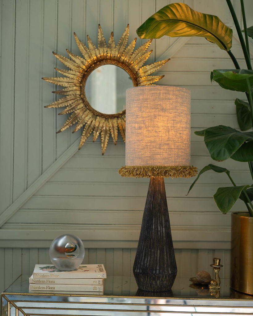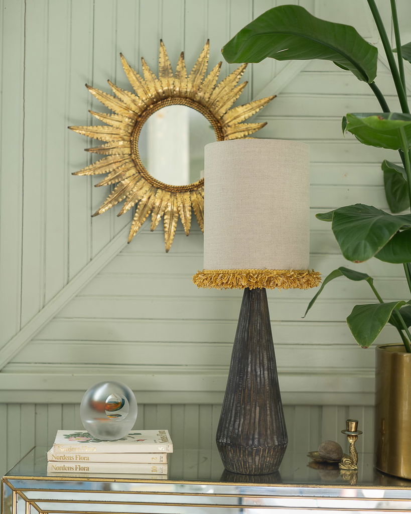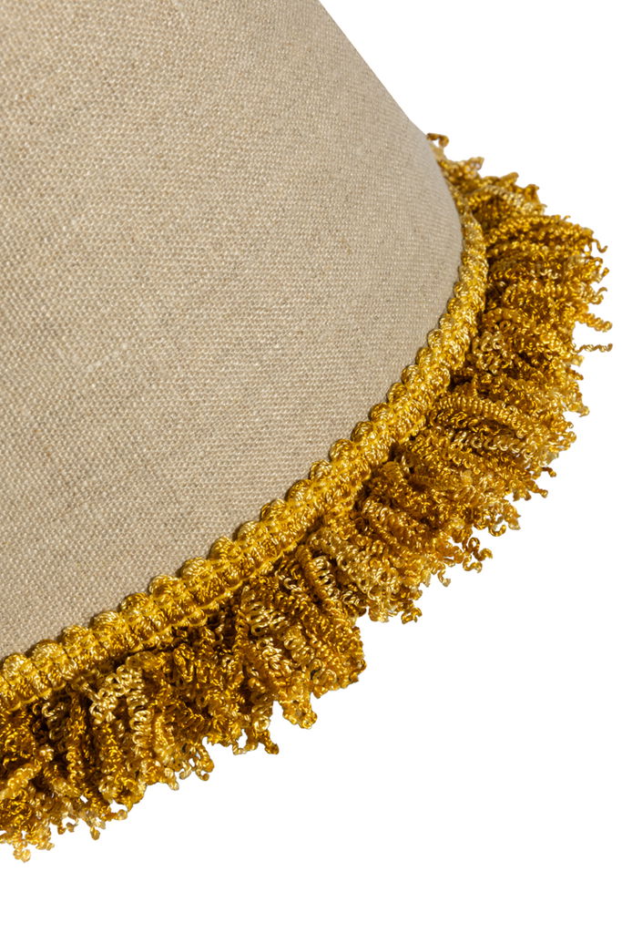 Elegant cylinderformad lampskärm i oblekt lin med dekorativ senapsgul frans. Perfekt för både retro och modern inredning.