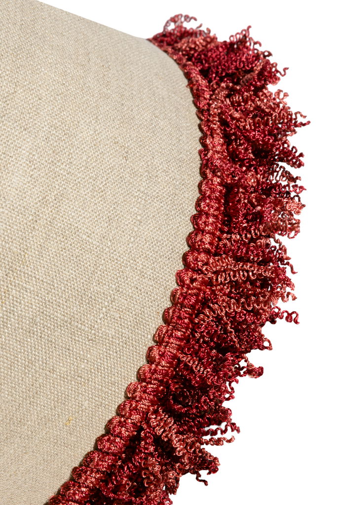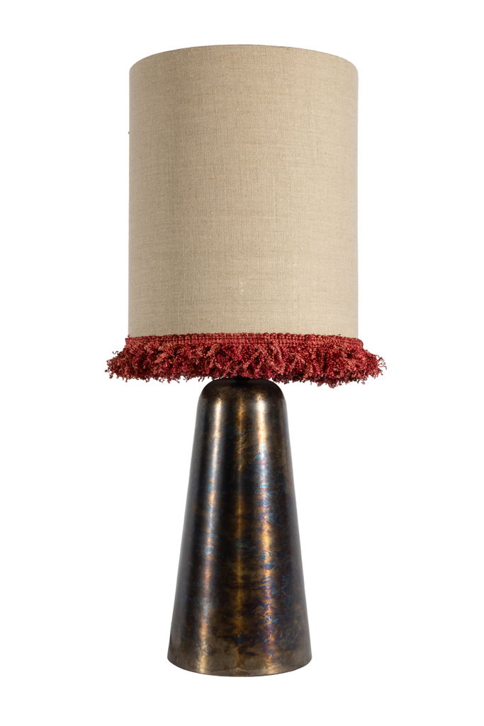 Elegant cylinderformad lampskärm i oblekt lin med dekorativ vinröd frans. Perfekt för både retro och modern inredning.