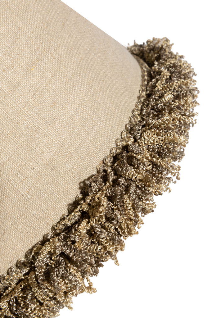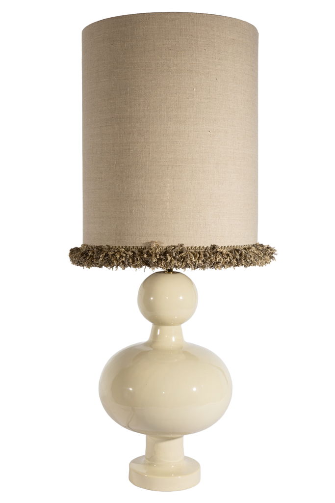 Elegant cylinderformad lampskärm i oblekt lin med dekorativ frans. Perfekt för både retro och modern inredning.
