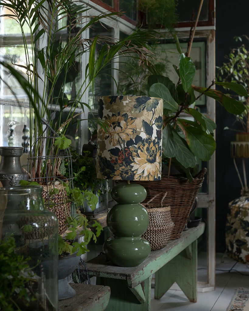 Elegant cylinderformad lampskärm i 'Solros'-tyg, skapar varmt dämpat sken med hösttoner. Perfekt för både retro och modern inredning.