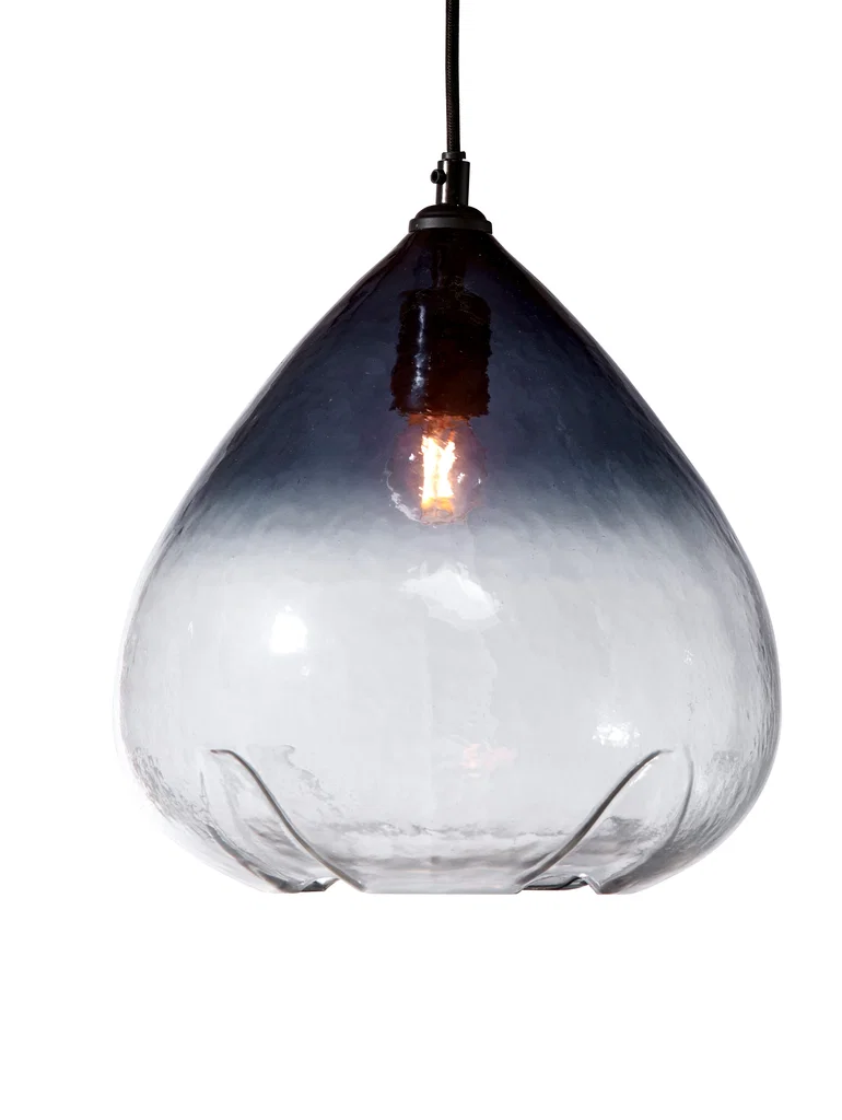 En vacker taklampa i handgjort glas med en ombré-effekt från toppen som tonar över till klart glas. Hänget är format som en tårdroppe och har ett rynkmönster längst ner. Det handgjorda glaset kan ha små ojämnheter som gör att ljuset reflekteras fint.