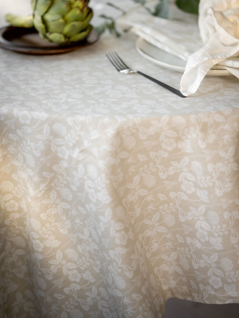 De Mina Duk 140x280cm Beige från Svanefors. En Bordsduk med tryckt design av Carl Larsson. Storlek 140x280cm.