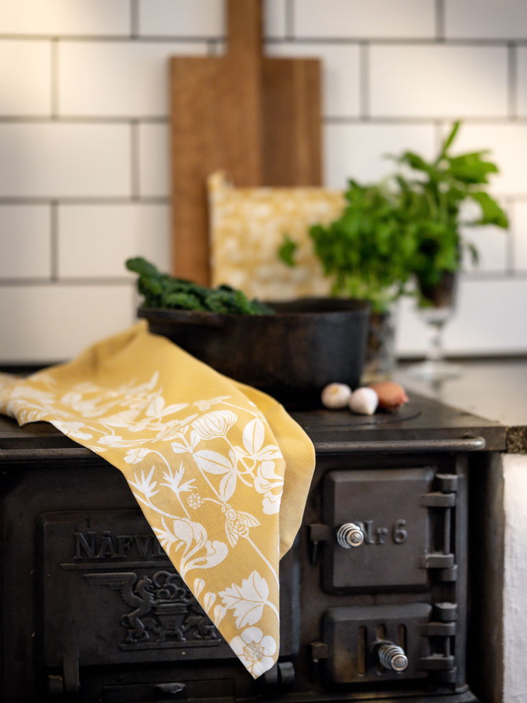 De Mina Kökshandduk 50x70cm Havre från Svanefors. En kökshandduk med tryckt design av Carl Larsson. Storlek 50x70cm med hängare i övre hörnet.