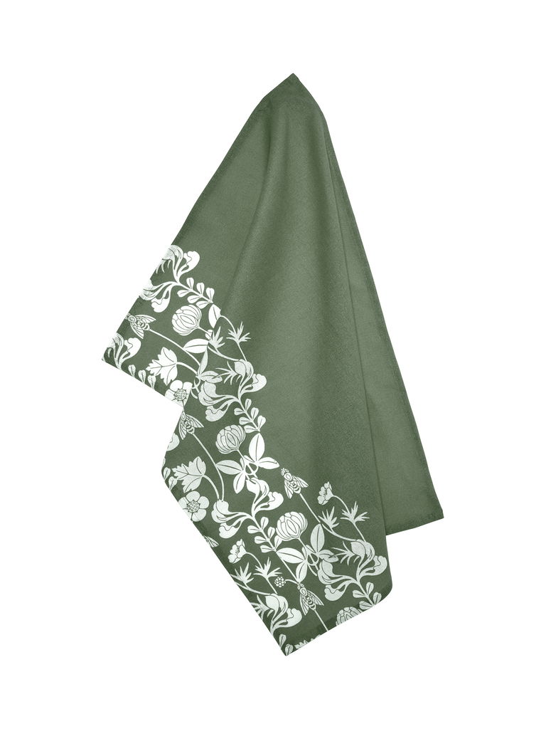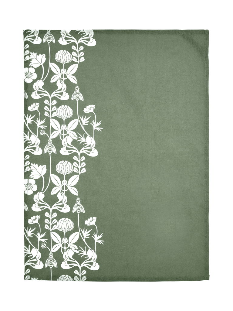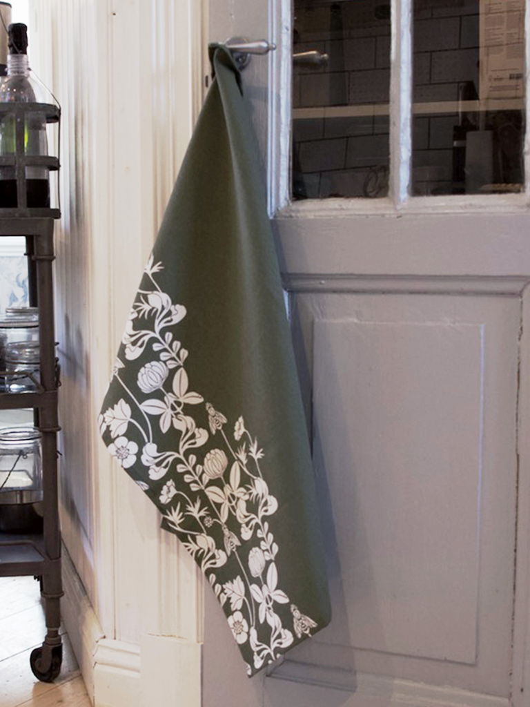 De Mina Kökshandduk 50x70cm Mossafrån Svanefors. En kökshandduk med tryckt design av Carl Larsson. Storlek 50x70cm med hängare i övre hörnet.