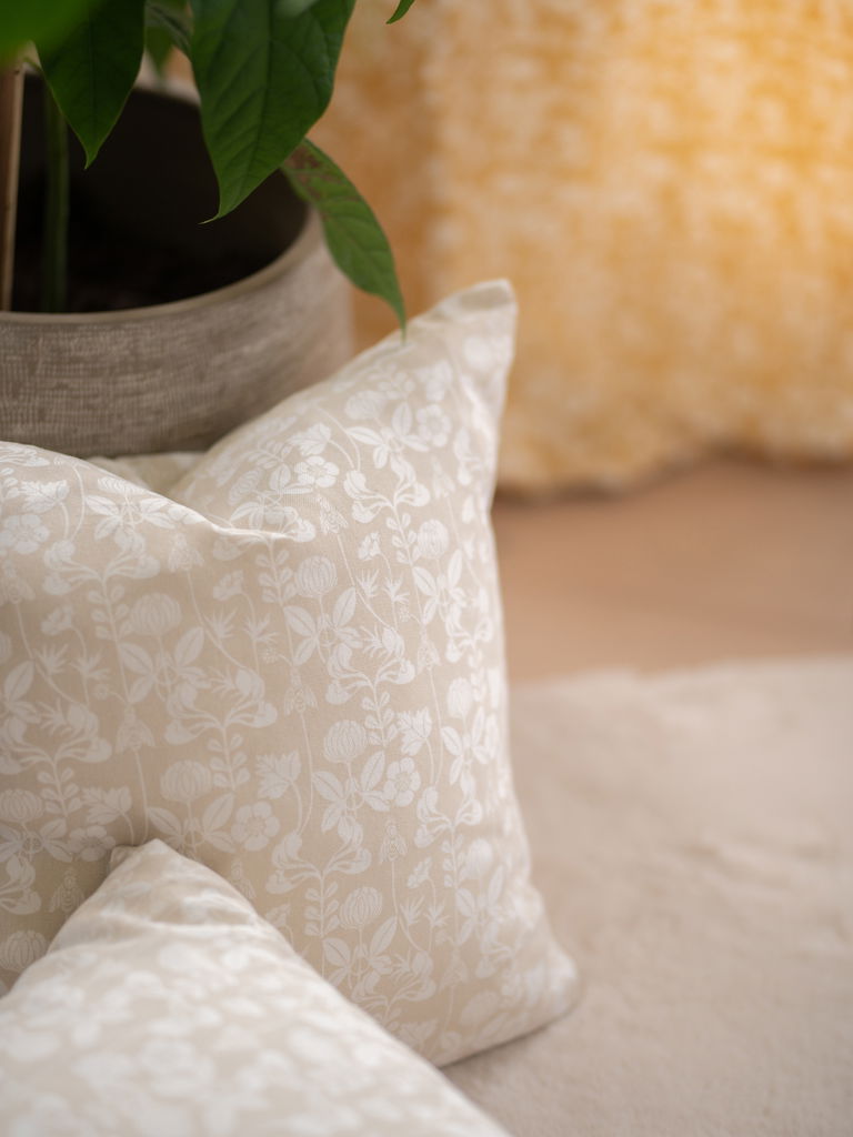 De Mina Kuddfodral 45x45cm beige från Svanefors. Ett kuddfodral i bomull med tryckt design av Carl Larsson. Går i samma tyg som "De Mina lampskärmar" se tillbehör för att matcha belysning och inredning!