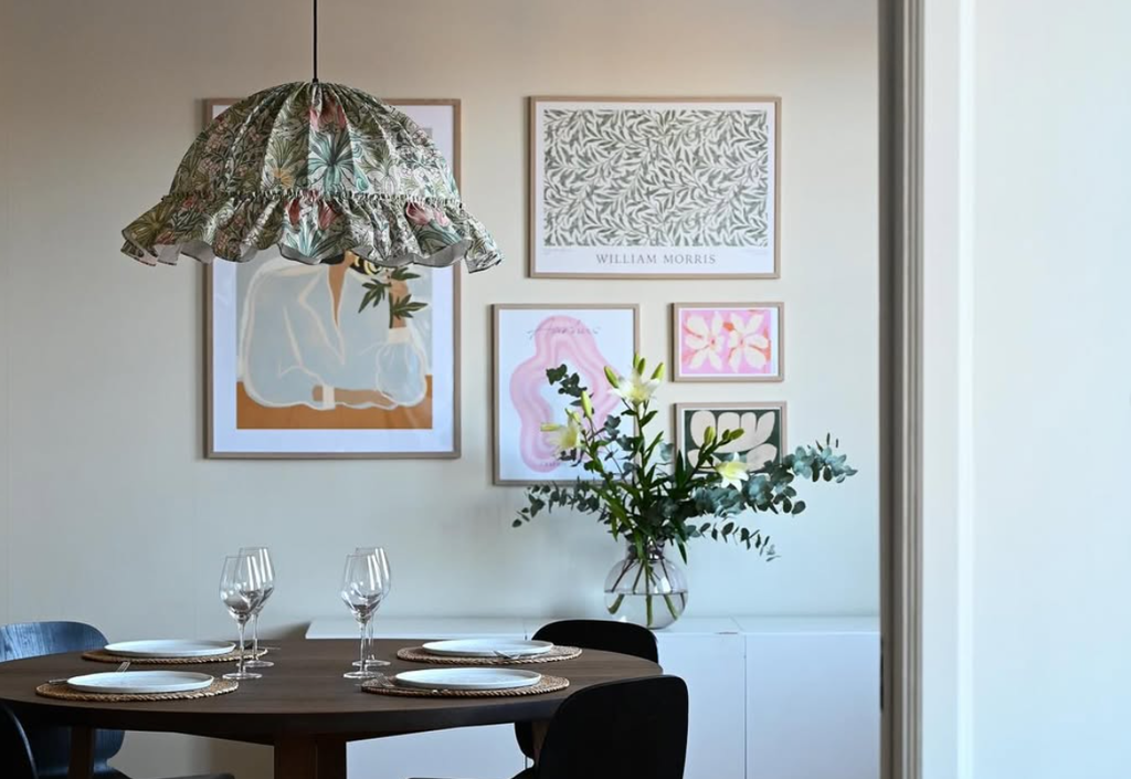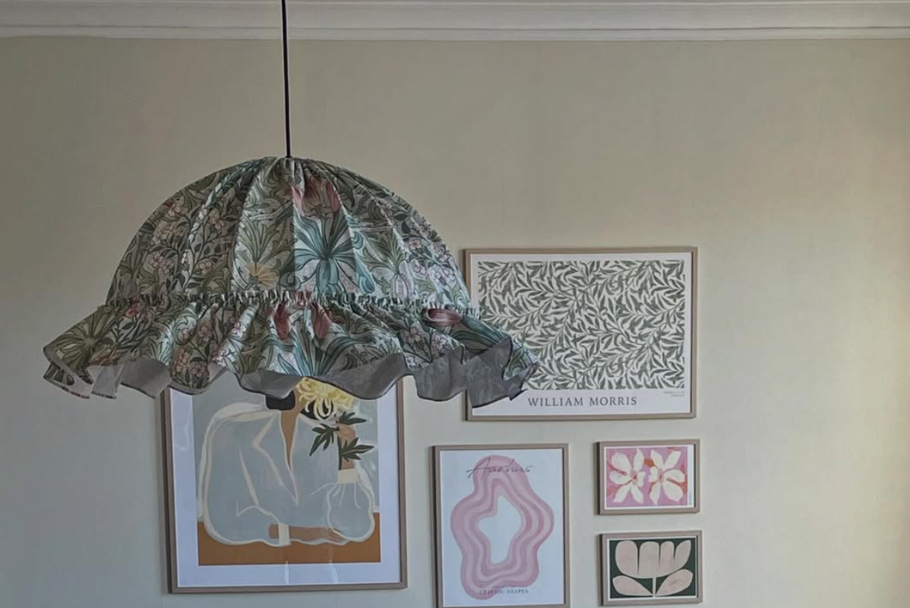 En trendig Dome Lampskärm som är kombinerad med en elegant volangkjol. Är klädd i ett av William Morris tyger som heter Woodland Weeds och kommer i färgen "Apple".