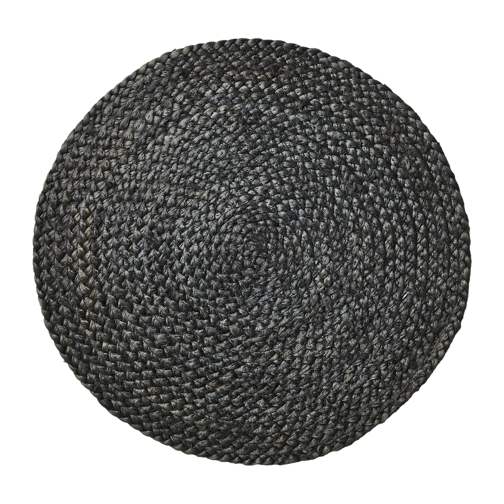Blågrått tallriksunderlägg i flätad jute som ger en elegant och modern känsla till dukningen. Det skyddar bordet mot spill, värme och repor samtidigt som det ramar in varje plats på ett stilfullt sätt.