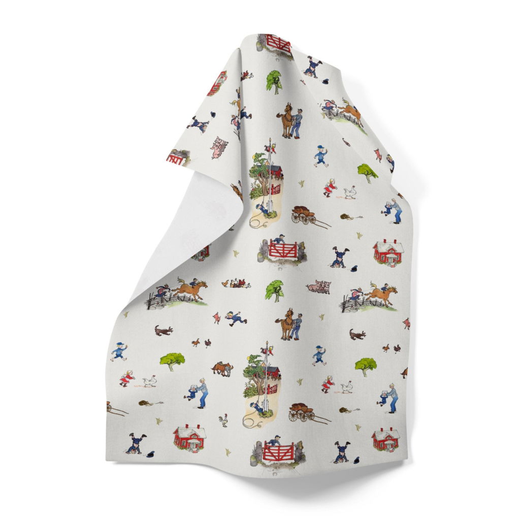 En kökshandduk i ett Emil i Lönneberga mönster med designer Astrid Lindgren. Storlek 46x70cm. Är tillverkad i 100% Bomull.