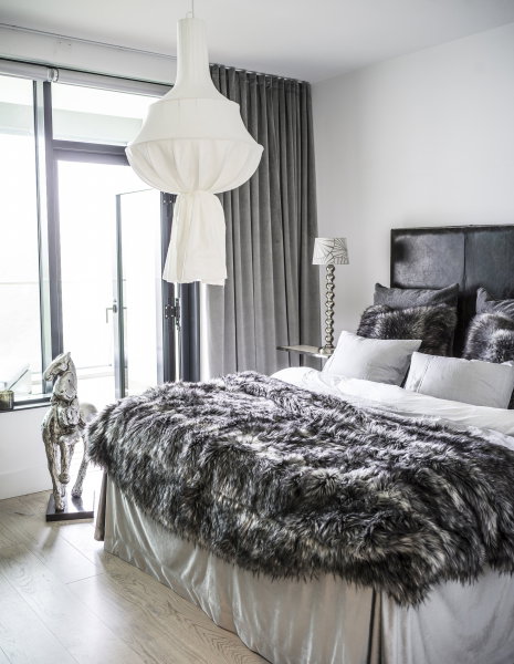 Den häftiga formen och det neutrala vita tyget gör att skärmen blir en utstickande detalj och gör sig fin i ett sovrum eller vardagsrum.