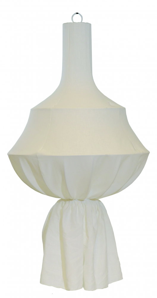 Vit empire taklampa i textil som ger mjukt och behagligt ljus. Den häftiga formen och det neutrala vita tyget gör att skärmen blir en utstickande detalj och gör sig fin i ett sovrum eller vardagsrum.