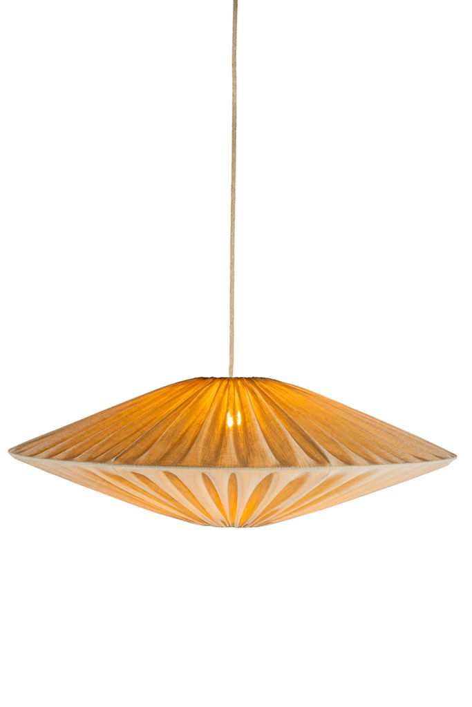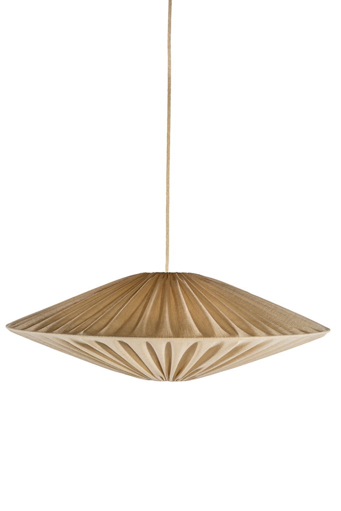 Figo takskärm 75 Bado sand från svensktillverkade Alde & Lind, har en stram form där tyget veckar sig mjukt och blir en mysig detalj till rummet. Är tillverkad i polyester men har en fin "linne-look", metallstommen är guldlackad.