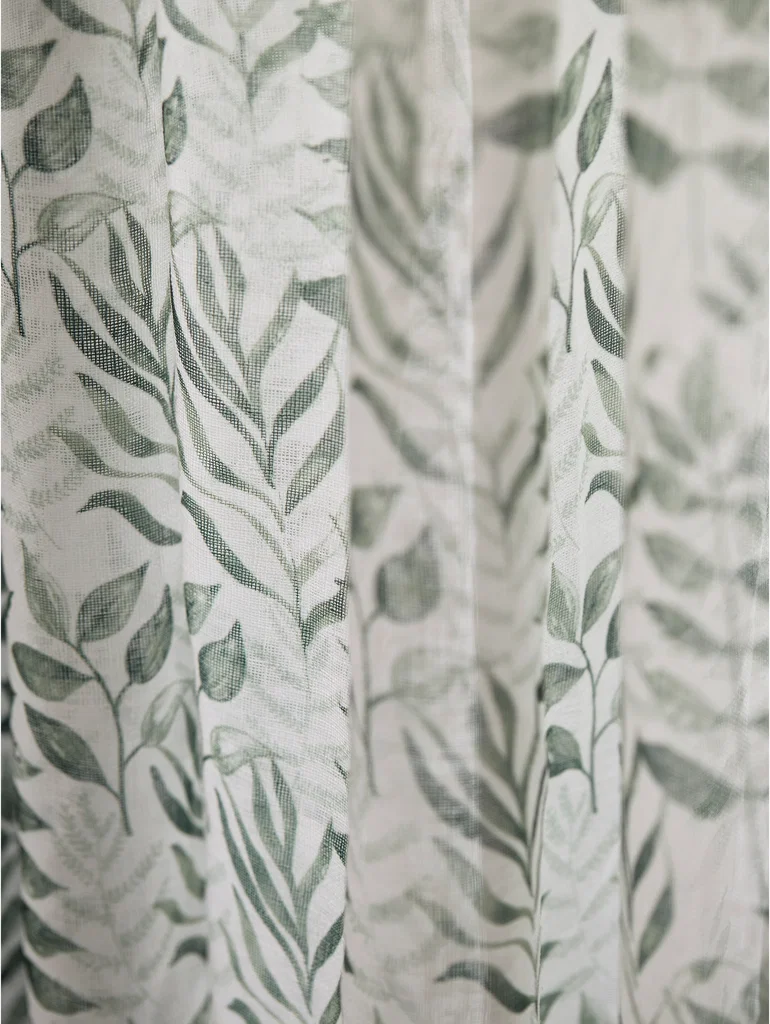 Eleganta gardiner i grönt och vitt som släpper in ljus på ett mjukt och behagligt sätt. Tyget är skirt med vacker struktur och subtil färgskiftning som ger gardinerna ett levande uttryck och ett naturligt fall. Passar perfekt för en harmonisk känsla i vardagsrum, matsal eller sovrum.