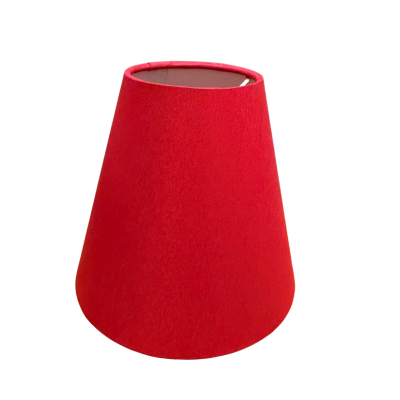 En rund och mindre lampskärm tillverkad i ett skimrande rött chintz tyg. Har ett klofäste. Kommer i storleken: 15cm i bottendiameter - 8cm i toppdiameter - 14,5cm i höjd.