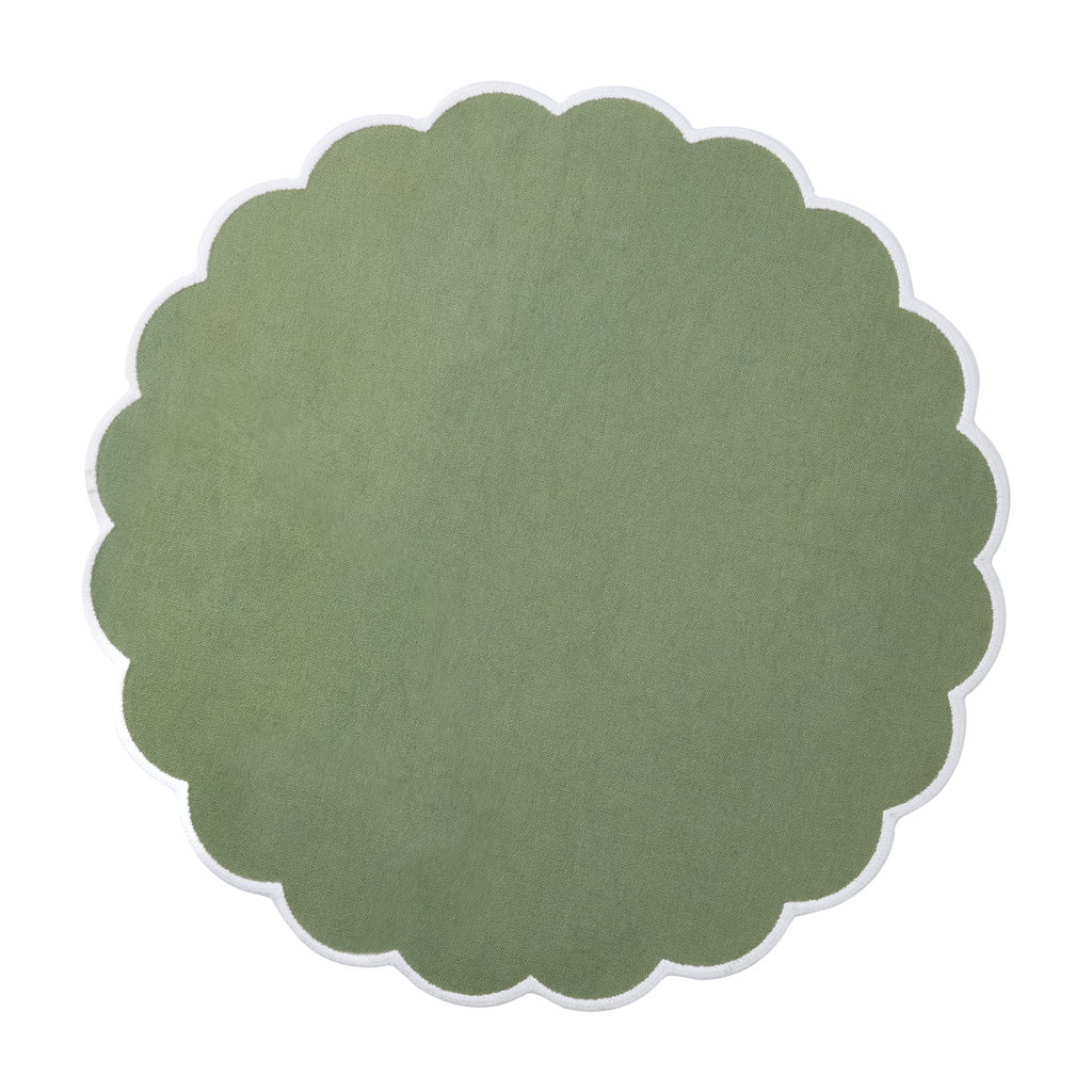 Grönt tallriksunderlägg med vit kant format som en blomma i bomull. Ger en fin färgklick till dukningen och ramar in varje plats på ett stilfullt sätt.