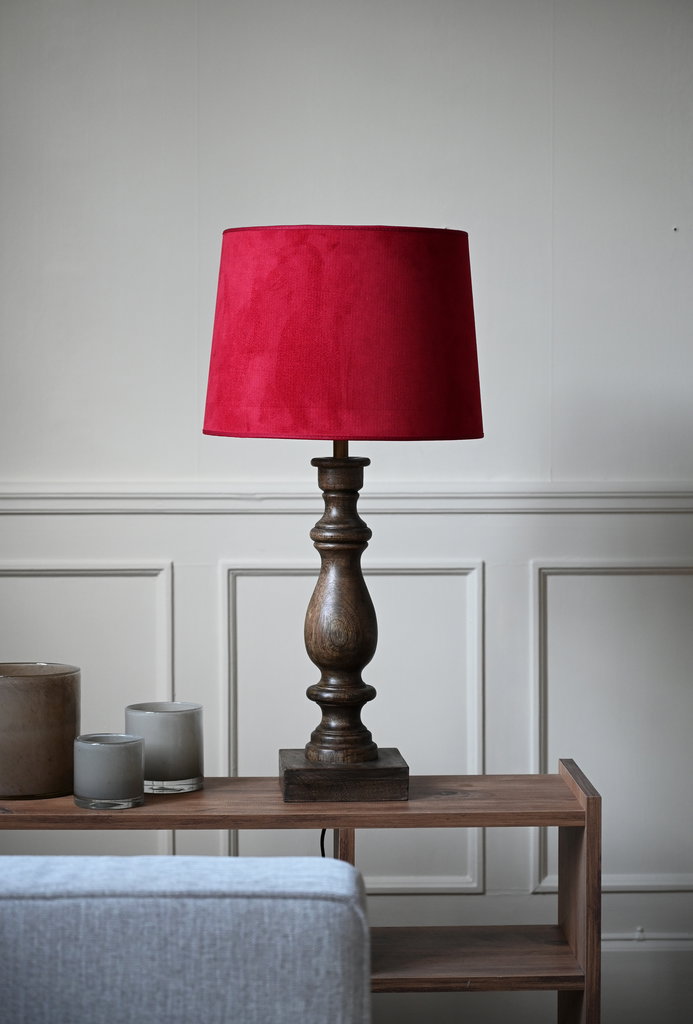 En hemtrevlig skärm som är tillverkad i ett rött polyestertyg med en sammetsfinish. Har en enkel rund formgivning och lampskärmen skapar ett mjukt, ombonat ljus och blir en dekorativ detalj i både vardagsrum, sovrum och hall.