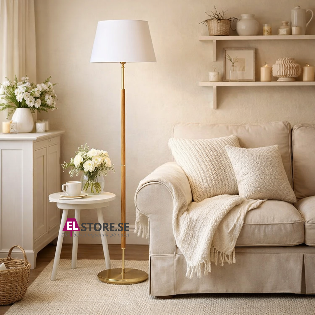 En elegant golvlampa i en vacker kombination av mässing och ek. Tullgarn pryder sin plats varsomhelst i ditt hem där du väljer att placera den. Passar perfekt för en allmänbelysning i vardagsrummet, hallen eller sovrummet!