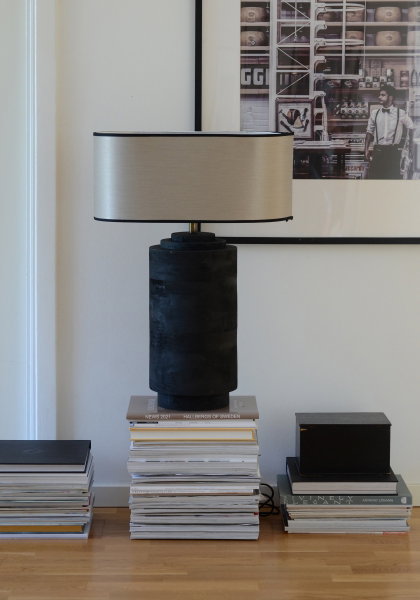 En special lampskärm i en häftig oval/cylindrisk formgivning i en naturfärg som har en glansig finish med kantband i en svart färg.