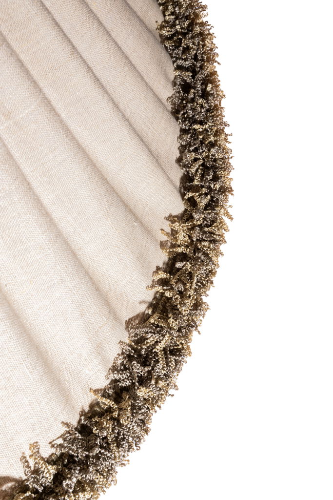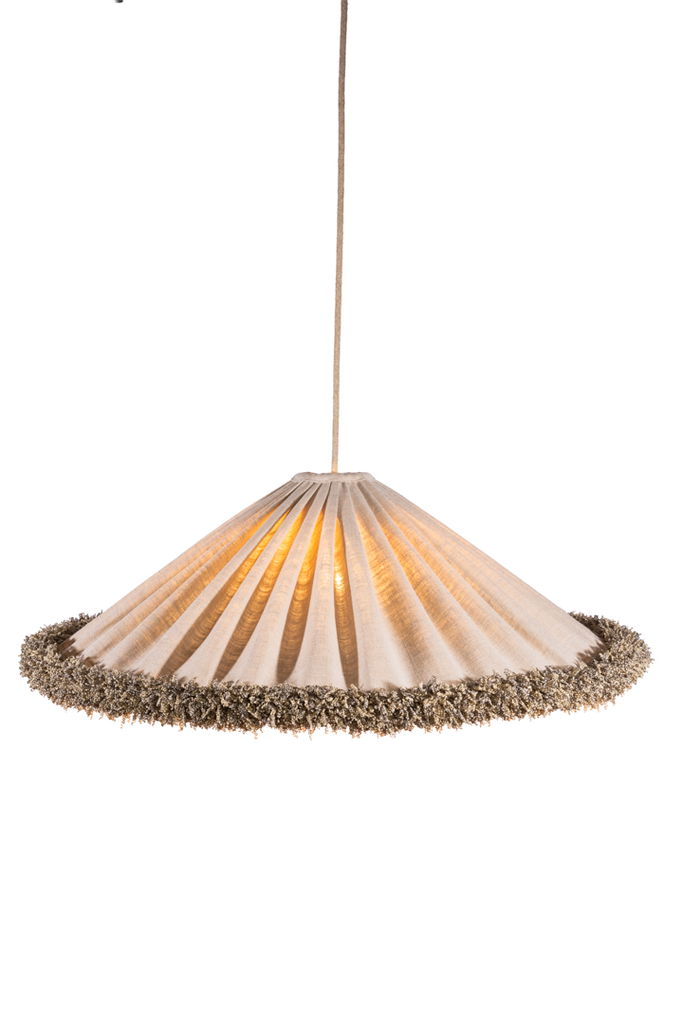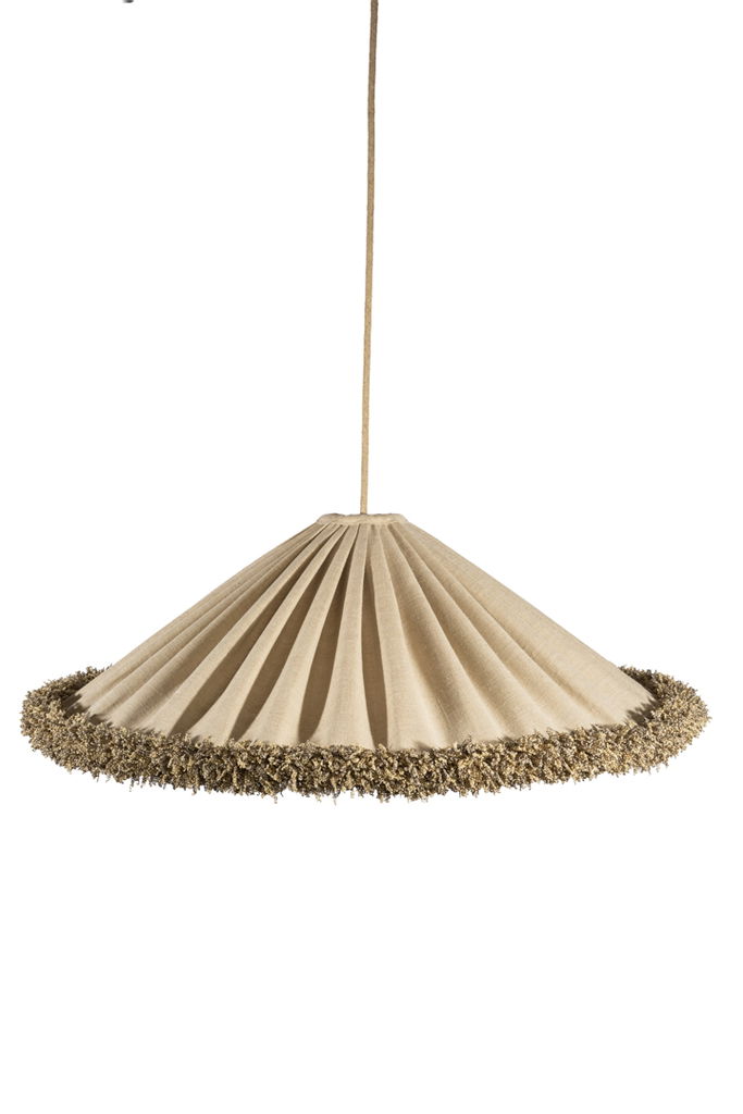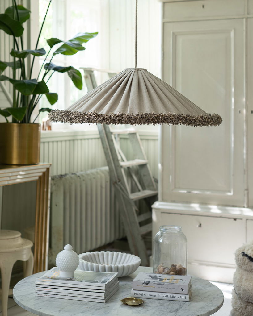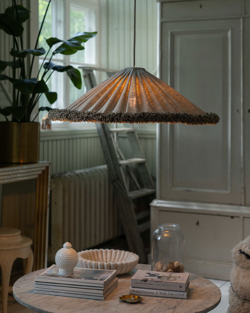 Grace Lin Takskärm 69 Frans Natur är en elegant och stilren takskärm som förgyller ditt hem med sin naturliga charm. Den konformade skärmen är klädd i ett oblekt hellinne, vilket ger en mjuk och jämn rynkad yta. Den kraftiga snörmakeri-fransen längs nederkanten matchar linnets naturliga ton och ger en harmonisk känsla.