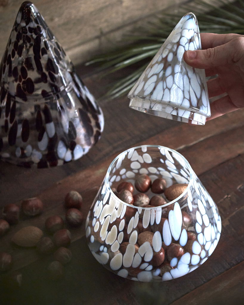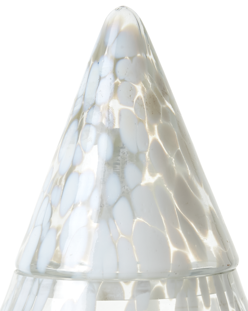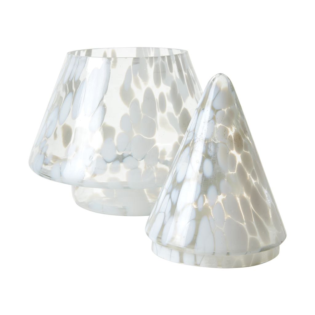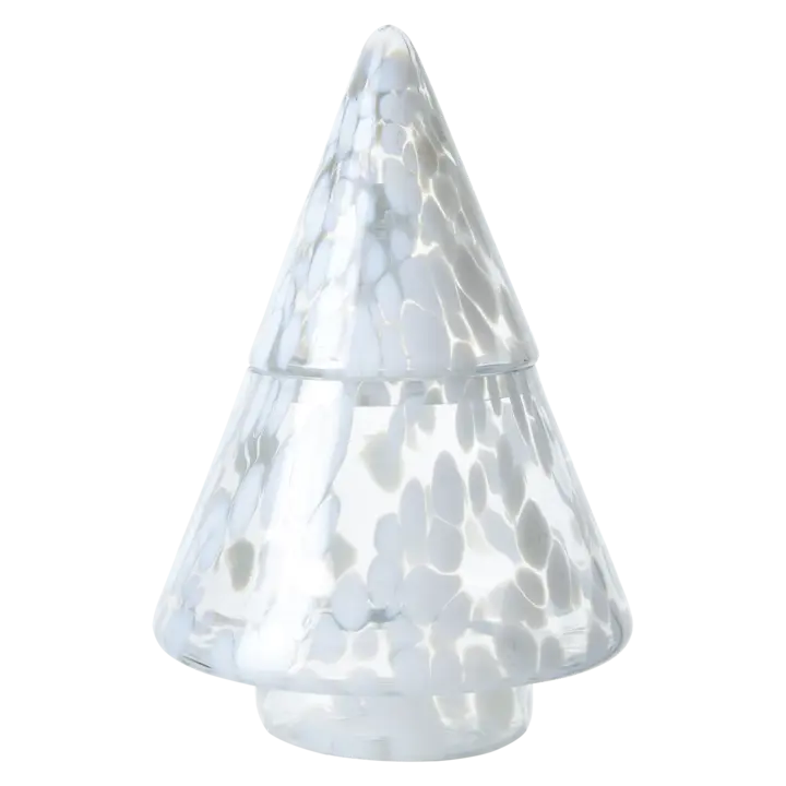 En vacker gran till verkat i munblåst glas i färgerna vit och isblå. En perfekt jul- och vinterdekoration, använd den som en skål eller placera en ljusslinga i.