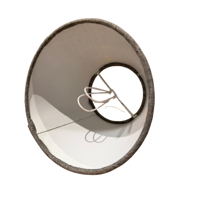 En rund och mindre lampskärm tillverkad i ett grovt linne med struktur och har en grå färg. Har ett klofäste fast för kronljus och längre ljuskällor. Kommer i storleken: 16cm i bottendiameter - 10cm i toppdiameter - 12cm i höjd