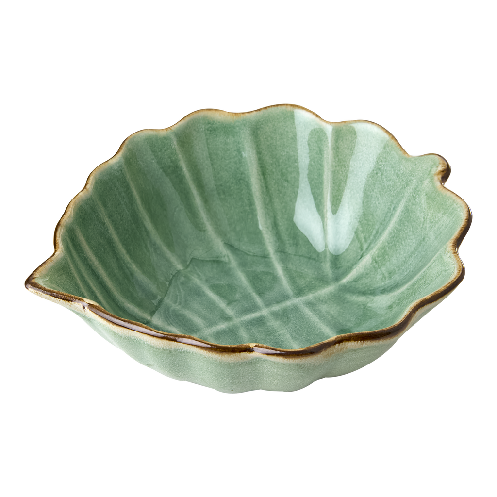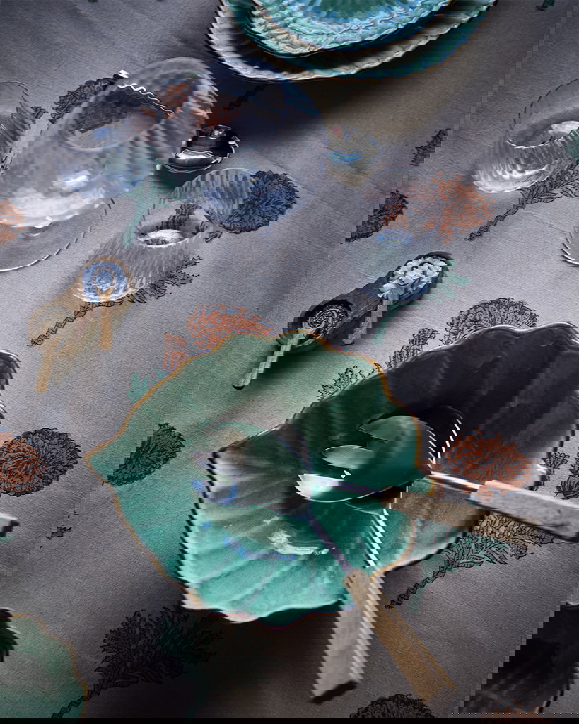 En stor grön serveringsskål formad som ett löv med en dekorativ vågig kant, ger dukningen en unik och naturinspirerad känsla. Perfekta för både vardag och fest, kombinerar funktion med stil och skapar en levande, elegant bordsupplevelse.