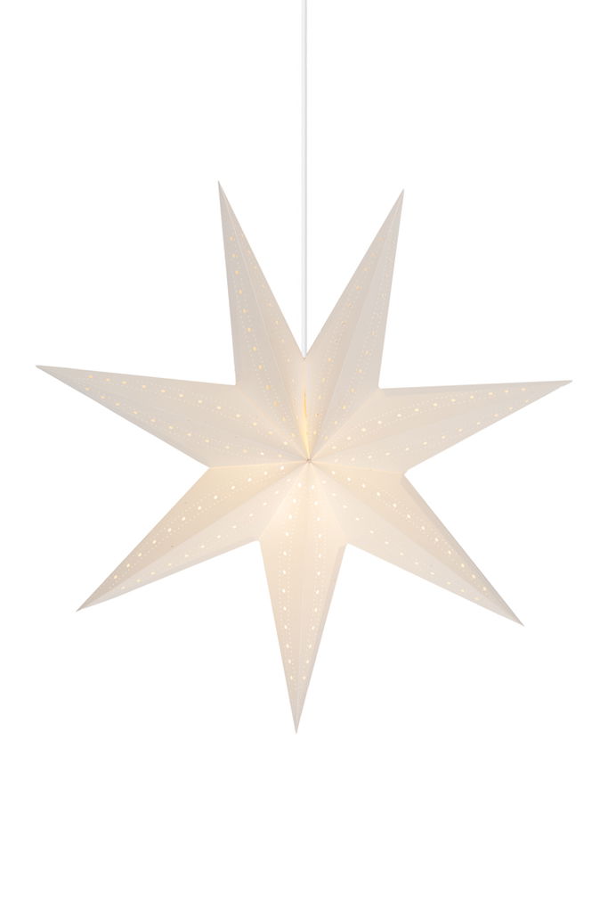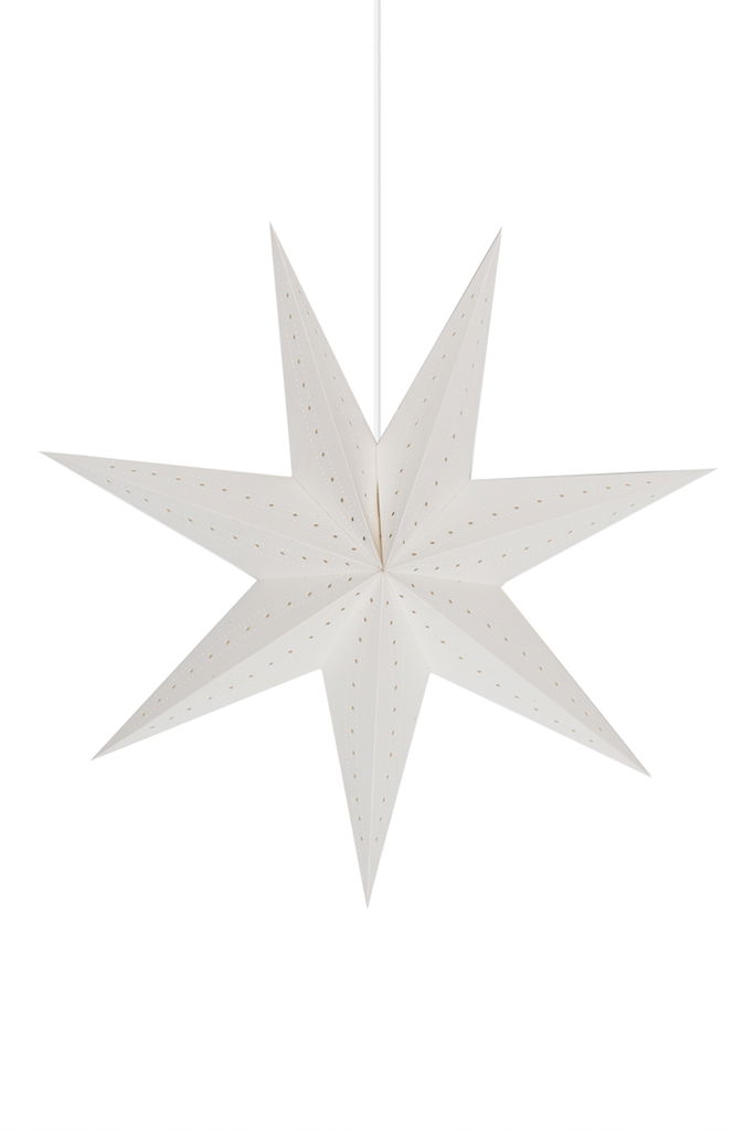 Henriette julstjärna 45cm vit från Alde & Lind. En handgjord och klassisk julstjärna i en modern tappning av ett vitt papper med parallella hål av olika storlekar som följs i långa girlanger och ger ett otroligt vackert ljusmönster över hela stjärnan.
